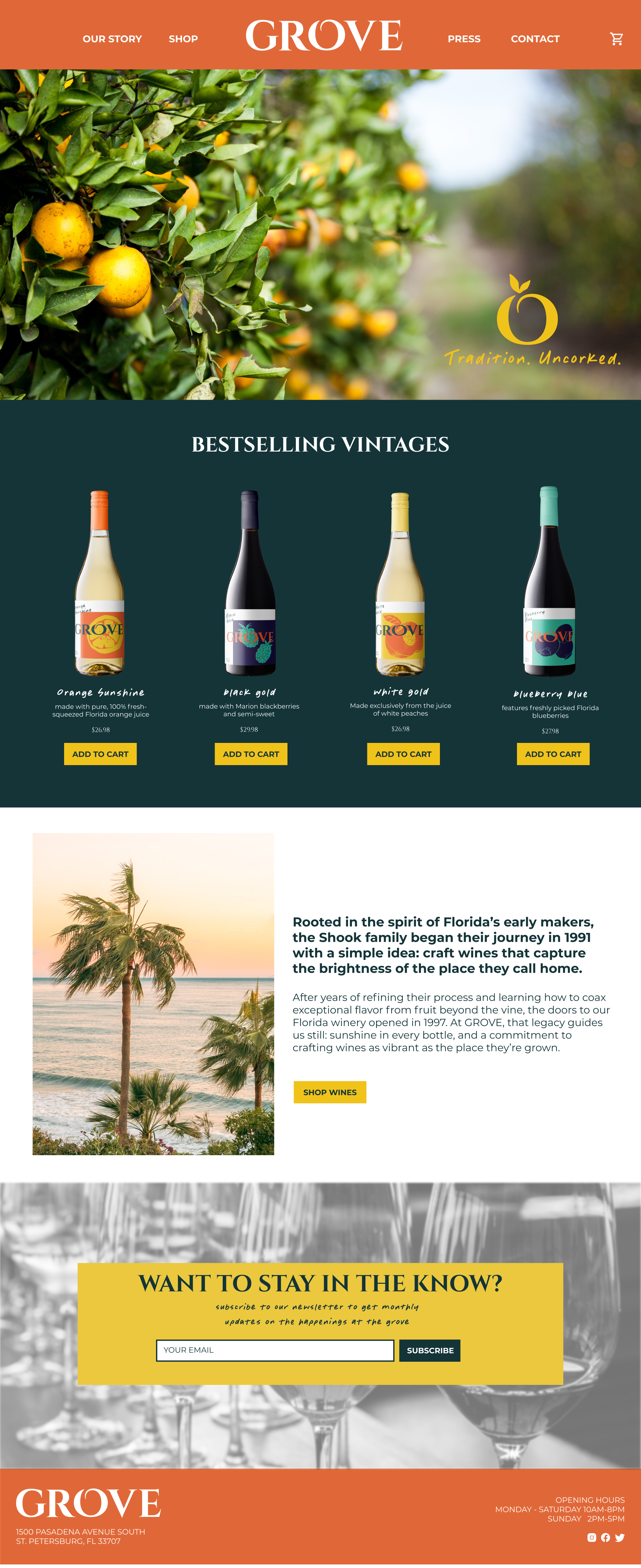 Grove is an elevated refresh for a Florida winery known for its tropical, citrus, and berry wines. The identity brings clarity and warmth to a brand rooted in Florida’s radiance—offering a bright, simple, and inviting look made for easy, sun-soaked moments.